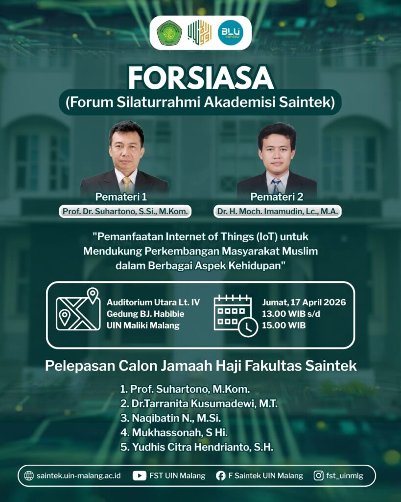 FST UIN Maliki Malang – (17/04/2026) Fakultas Sains dan Teknologi (FST) UIN Maulana Malik Ibrahim Malang melalui Forum Silaturahmi Akademik Saintek (Forsiasa) sukses menyelenggarakan diskusi diseminasi bertajuk “Pemanfaatan Internet of Things (IoT) untuk Perkembangan Masyarakat Muslim dalam Berbagai Aspek Kehidupan”. Kegiatan yang berlangsung di Aula Fakultas Sains dan Teknologi 17 April 2024 dan ini dihadiri oleh […]