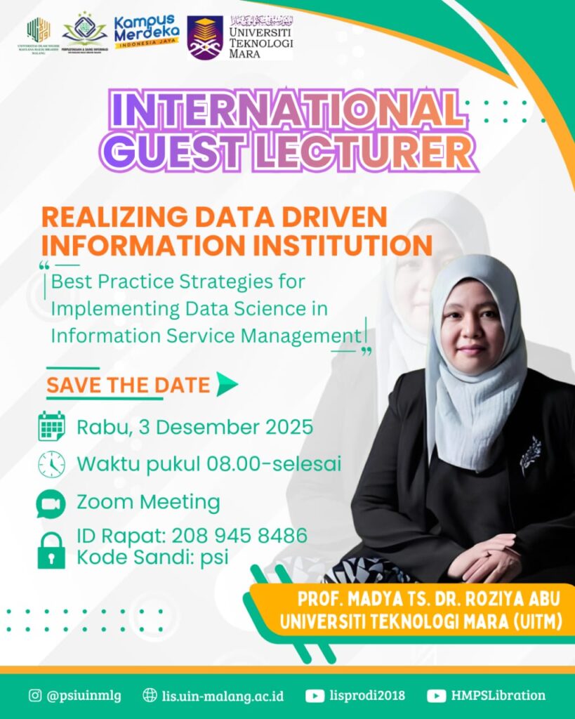 FST UIN Maliki Malang - (03/12/2025) The Library and Information Science (PSI) Study Program of UIN Maulana Malik Ibrahim Malang held an international guest lecture entitled “Realizing Data Driven Information Institution Best Practice Strategies for Implementing Data Science in Information Service Management”. The session was held online since 08.00 WIB and presented Prof. Madya Ts. Dr. Roziya Abu [...]