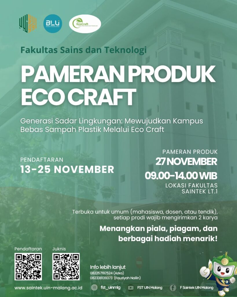 FST UIN Maliki Malang - (27/11/2025) The Faculty of Science and Technology held an Ecocraft Product Exhibition as a joint movement towards a plastic waste-free campus. The event took place at 09.00-14.00 WIB on the 1st floor of the faculty building, presenting creative works of collaboration between lecturers and education staff together with students from each study program. As a form of active participation, 11 study programs [...]