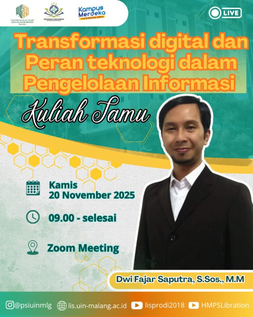 FST UIN Maliki Malang - (20/11/2025) The Library and Information Science (PSI) Study Program of the Faculty of Science and Technology of UIN Maulana Malik Ibrahim Malang organized a dual-themed guest lecture on “Information Retrieval in the Digital Age: New Concepts, Technologies, and Challenges” and “Realizing Data-Driven Information Institution: Best Practice Strategies for Implementing Data Science in Information Service Management.” [...]