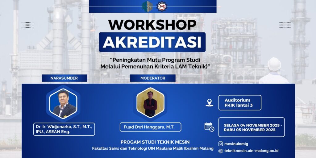 FST UIN Maliki Malang - (05/11/2025) The Mechanical Engineering Study Program closed a series of Accreditation Workshops with the theme “Improving the Quality of Study Programs Through Fulfilling Engineering LAM Criteria” which took place at the 3rd floor FKIK Auditorium from 4 to 5 November 2025. The activity presented Dr. Ir. Widjonarko, S.T., M.T., IPU., ASEAN Eng. as a resource person and Fuad Dwi Hanggara, M.T. [...]
