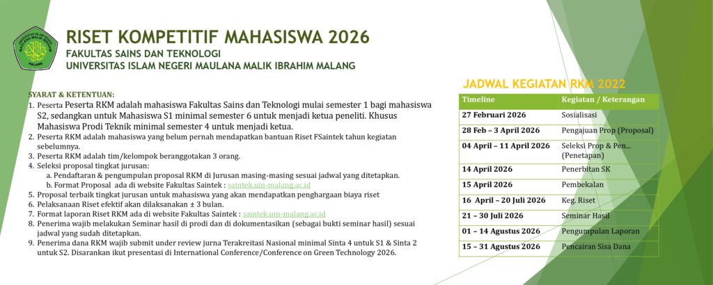 Malang – Fakultas Sains dan Teknologi (FST) Universitas Islam Negeri Maulana Malik Ibrahim Malang secara resmi membuka program Riset Kompetitif Mahasiswa (RKM) untuk tahun 2026. Program ini bertujuan untuk meningkatkan kualitas penelitian mahasiswa dan mendorong publikasi ilmiah di jurnal terakreditasi nasional. Sosialisasi kegiatan telah dilaksanakan pada tanggal 27 Februari 2026 di Audiorium Utara lantai IV, menandai dimulainya rangkaian kegiatan RKM tahun ini. Pendaftaran dan pengumpulan proposal berlangsung dari tanggal 28 Februari hingga 3 April 2026 di masing-masing program studi. “Peserta RKM adalah tim/kelompok beranggotakan 3 orang,” demikian salah satu butir syarat dan ketentuan yang disampaikan dalam dokumen resmi fakultas.