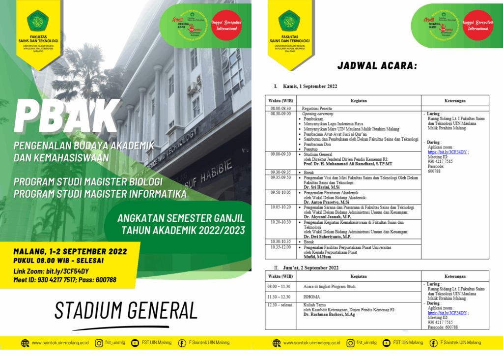 为配合2022/2023学年单学期科技学院生物学硕士和信息学硕士学习课程学术和学生文化介绍(PBAK)体育场综合活动,我们邀请生物学硕士和信息学硕士学习课程的新生于以下时间参加这些活动:[......][......][......][......]:2022 年 9 月 1-2 日 [...]